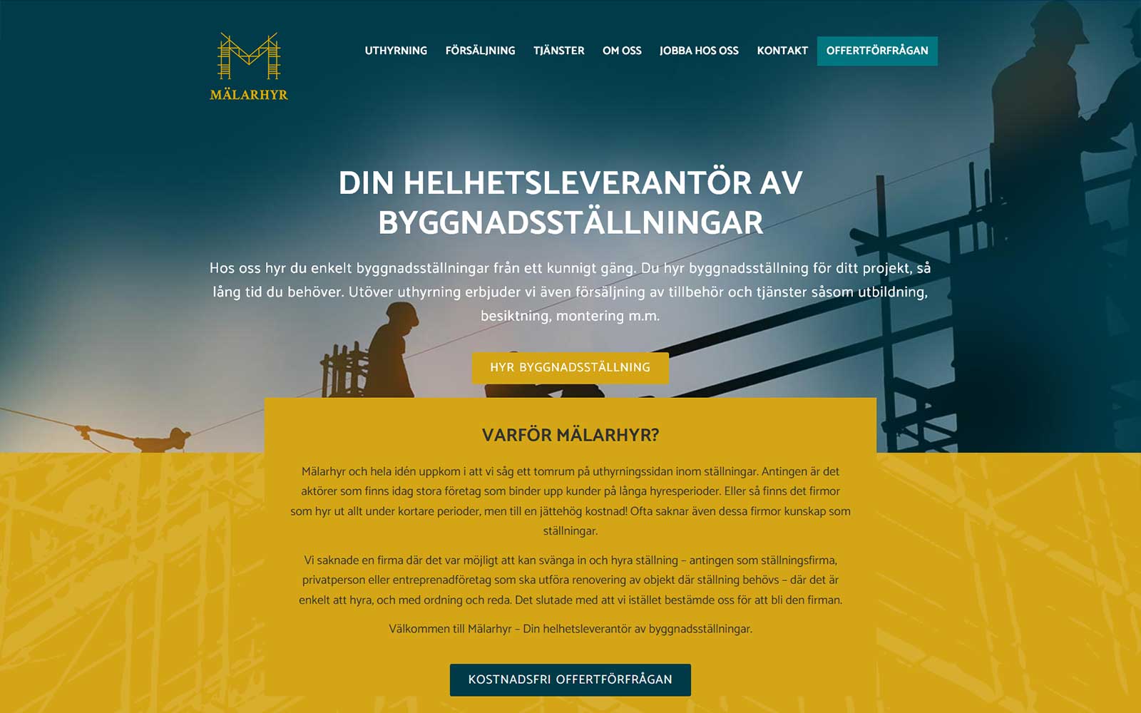 Mälarhyr erbjuder uthyrning av byggnadsställningar men även försäljning av tillbehör och tjänster såsom utbildning, besiktning, montering m.m.